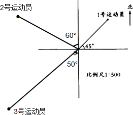 (1)1号运动员的落地点在靶心O______偏______°方向______米处.