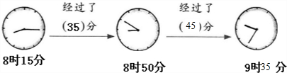 首先,读出钟面时刻,然后用后一个时刻减去前一个时刻;即可得解.