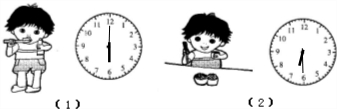 分析:(1)是小朋友在刷牙,应是早晨6:00;(2)是这个小朋友在用早餐,是早晨6:30;根据钟表的认识,6时时,分针指向12,时针指向6,6时30分时,时针指向6和7中间,分针指向6.