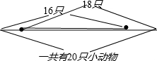 分析:根据题干,从左往右数大象排第16,从右往左数小猫排第18大象,那么把16+18=34只,这比已知的总只数20多出了34-20=14只,正好是小猫到大象之间(包括小猫和大象在内)的小动物重复多加了一次的只数,由此再减掉大象和小猫,就是它们之间的动物的只数.