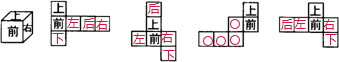 如图是一个正方体,它的三个侧面上分别写着“上、前、右”,与这三个侧面相对的侧面上分别写着“下、后、左”.判断右面的四个网格图哪些是正方体的展开图,如果是,请在空白的小方格内按照正方体的标记规则标明“下、后、左、右”.如果不是,请在小方格内画圈.