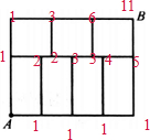 解法二:或见右图,与B点相邻的两个点,经过它们的路线分别有5条和6条,因此共有:5+6=11(条).