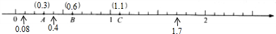 将0.4,1.7,0.08表示在下面的线上,并写出A,B,C所表示的数.