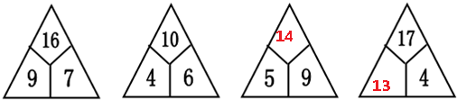 解答:解:(1)5+9=14,17-4=13,所以可将三角形中的数字补充完整如下: