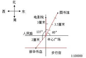 (3)新华书店在西南,与正北成135度夹角,离中心广场2000米处.