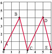 根据数对表示位置的方法在平面图中依次标出点A(0,0),B(2,4),C(3,0),D(5,4),E(6,0),顺次连接A、B、C、D、E,围成的图形是一个英文字母大写的M.