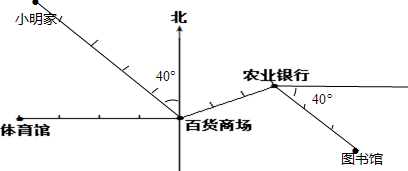 体育馆在百货商场正西方向2000m处,小明家在百货商场的北偏西40°方向2500m处,图书馆在农业银行东偏南40°方向1500米处.下面是小明坐在出租车从家去图书馆的路线图.