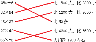 分析:(1)可以先进行估算:①把380看做360,除以6的商是60,所以380÷6的商比60多;②把32看做30、64看做60,30×60=1800,把32看做40、64看做70,40×70=2800,所以它们的乘积大于1800,而小于2800;③把48看做50,37看做40,50×40=2000,若把48看做40,37看做30,40×30=1200,所以它们的乘积是大于1200,小于2000;同样的方法,再估算出④⑤的乘积的大小范围,即可进行连线;