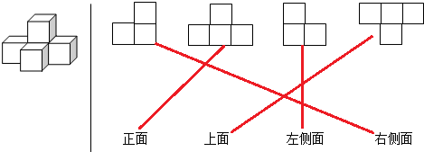 (2)观察图形可知,从正面看到的图形是2层:下层3个正方形,上层1个正方形靠中间;从上面看到的图形是两行:后面一行3个正方形,前面一行1个正方形靠中间;从左侧面看到的图形是2层:下层2个正方形,上层一个正方形靠左边;从右侧面看到的图形是2层:下层2个正方形,上层1个靠右边,据此即可连线.