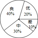分析:把六年级学生总人数看作单位“1”,用得优的人数2除以10就是得优占的百分比;用得良的人数4除以10就是得良占的百分比;用得中的人数3除以10就是得中占的百分比;再用1减去得优、得良、得中占的百分比就是得差占的百分比;把圆周角360°看成单位“1”,分别用乘法求出得优、得良、得中、得差占的度数,由此把圆分成四部分,然后标上每部分的名称和所占的百分数画出扇形统计图即可.