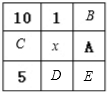 .分析:已知它每行、每列、每条对角线上三个数的和都相等,设中间的数为x,则幻和为3x,由图可知,B=2x-5,10+1+(2x-5)=3x,解得x=6;由此求得幻和为18,进一步推出C=3,A=9,B=7,D,=11,E=2.