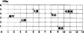 故答案为:电影城,(5,5),(9,1),电影城,书店.