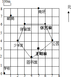 分析:根据数对的意义结合图中所表示的距离,即可确定王明和张芳家的位置,及张芳活动路线.