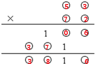.分析:因第四行的末尾是1,第五行的右数第二位是1,可知第三行的右数第二位是0,根据乘法口决,第一行的末尾只能是1,3,7,9,第二行和它对应的数应是1,7,3,9.中的一个数,1不合题意,又因每三行的右数第二位是0,第三行的数只能是一百零几.第一行的数只能是21或51,52,53,54,第二行的个位只能5或2,21,52,54,不合题意,第一行只能是53,第二行是72.据此解答.