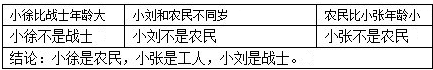 分析:本题要根据称谓之间的逻辑关系,通过排除法,从而推出谁是工人:小刘和农民不同岁,说明小刘不是农民,农民比小张年龄小,说明小张不是农民,所以小徐是农民.已知小徐比战士年龄大,农民比小张年龄小,即小徐比小张年龄小,所以小张既不是战士也不是农民,所以小张是工人,那么剩下的小刘就是战士了.本题可通过列表解答.