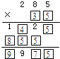 分析:因为285乘一个数得到四位数,这个数必大于3小于8,285×4=1140,285×5=1425,285×6=1710,十位是2的只有5,285乘以一个数得到三位数,第二个因数的十位只能为1、2、3,还要保证积的十位为9,2850+1425=4275,5700+1425=7125,8550+1425=9975,只有十位是3符合题意,由此问题得解.