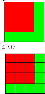 我们根据红、绿正方形边长的关系,把绿色正方形平均分成16份,红色正方形正好为9份,绿色正方形露出部分为7份.
