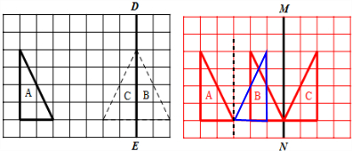 (2)通过观察图形,可知左边的图形B和图形C关于对称轴DE对称;