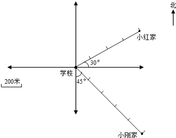 (1)小红家在学校的东偏北30°方向上,距离学校约是800米.