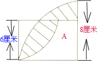 分析:如下图所示,阴影部分的面积可以转化为以半径为8厘米(圆心角为90度)的扇形面积减去其中空白部分A的面积,而空白部分A的面积又正好是长方形的面积减去半径为6厘米(圆心角为90度)的扇形面积.