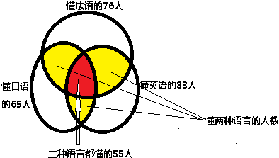 100位大学生中每人至少懂一种外语,其中76人懂法语,83人懂英语,65人懂日语,懂三种外语的有50人,只懂两种外语的有