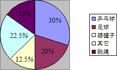分析:先求出总人数,然后求出乒乓球、足球、跳绳、踢毽子、其它的各占总人数的百分之几,进而绘出扇形统计图.