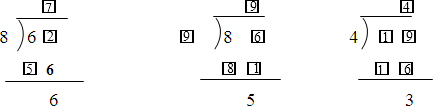 分析:(1)由商与除数乘积的末尾为6可知,只有8×7的末尾是6,因此商为7,被除数为56+6=62;
