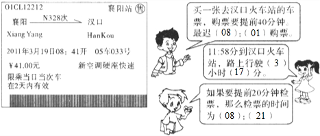 分析:从这张火车票上可以看出,发车时间是19日08:41,购票要提前40分钟,用发车时刻减去提前购票时间就是购票的最迟时刻;用到汉口的时刻减发车时刻就是路上行驶的时间;用发车时刻减去提前检票时间就是检票的时刻.