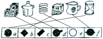 图中有A、B、C、D、E、F六种物品,从上向下看,得到这些物品六个投影图.请你用线段把这些物品和它的投影图一一对应起来.