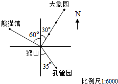 (1)孔雀园在猴山的南偏东35°方向.熊猫馆在猴山西偏北30°方向.