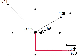 食堂在操场东偏北30°方向上,所以食堂的位置如下图所示;