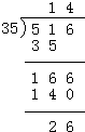 516÷35=14…26,