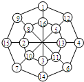 分析:将16个数相加行算式:1+2+3+…+16=(1+16)+(2+15)+…+(8+9)=17×8,据此算式可将数分为四组,每组和为34,即每条边上4个数的和为34;要使两个八边形上8个数的和也相等,可将每组括号中的数分布按大小均匀布在图中的内图和外圈的空中,这样两个八边形上8个数的和为136÷2=68.