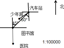 ②汽车站在图书馆的北偏东45°方向2千米处.