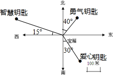 (1)“勇气钥匙”的位置是北偏东40°,距离宝箱100m处.