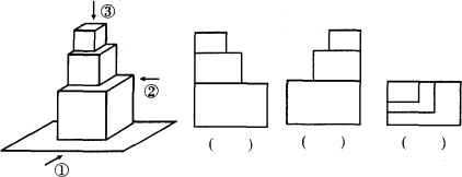 分析:观察图形可知,①是从左面拍摄到的图形是2列:左边一列1个正方形,右边一列2个正方形;②是从正面拍到的是两列:左边一列2个正方形,右边一列1个正方形;③是从上面拍摄到的图形是2行:前面一行2列,左右各一个正方形,后面有一列1个正方形靠左边;