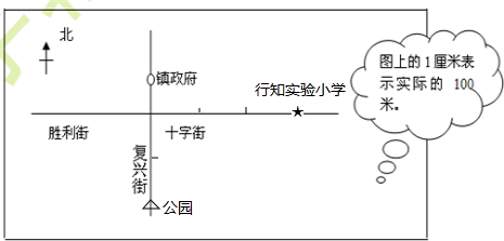 (2)行知实验小学在十字街东边,离十字街的图上距离是300÷100=3(厘米),位置如下图:,