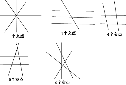 根据在同一平面内,两条直线的位置关系和多次试得出:①一点个交点②3个交点的③4个交点④5个交点⑤6个交点