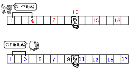 (2)小羊和老虎同时起跳,小羊能逃走。因为老虎第三次跳进陷阱,所以老虎不能吃到小羊。 |