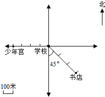 (2)书店在学校南偏东45°方向300米处.