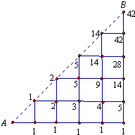 分析:我们把学学洗的5个碗过程看成从起点向右走5步(即洗几个碗就代表向右走几步),思思拿5个碗的过程看成是向上走5步(即拿几个碗就代表向上走几步),摞好碗的摞法,就代表向右、向上走5步到达终点最短路线的方法.由于洗的碗要多余拿的碗,所以向右走的路线要多余向上走的路线,所以我们用下面的斜三角形进行标数,共有42种走法,即代表42种摞法.