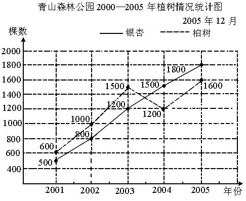 (1) ¼ûÉÏͼ£®Ó¦×¢Òâ±ê³öͼÀý£®(2)ÕâÎåÄê¹²Ö²ÒøÐÓÊ÷5800¿Ã£¬¹²Ö²°ØÊ÷5900¿Ã£»Æ½¾ùÿÄêÖ²Ê÷2340¿Ã£® (3) Ö²ÒøÐÓÊ÷µÄ¿ÃÊýÊÇÖðÄêÔö¼Ó£¬¶øÖ²°ØÊ÷µÄ¿ÃÊýÂÔÓв¨¶¯£¬´ÓͼÖпÉÒÔ¿´³öÓнµÓÐÉý£¬ÒòΪ2004ÄêÖ²µÄ¿ÃÊý±È2003ÄêºÍ2005Äê¶¼ÉÙ£®(4) ÂÔ |