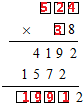 根据第一次乘得的积,可求出上面的因数是4192÷8=524,则根据第二次乘得的积是1572,则下面的因数的十位上是1572÷524=3,即本题是524×38=19912,据此即可解答.