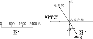 (2)科学宫在人民广场西面1600米处,学校在人民广场南偏东30°方向1200米处.在图2中画出科学宫、学校所在的位置.