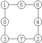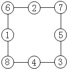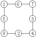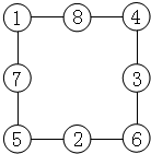 当A+B+C+D=20时,每条边上的3个○内数的和是:(20+36)÷4=14;1+8+4+7=20,1+8+5=14,8+4+2=14,4+7+3=14,7+1+6=14;可得: