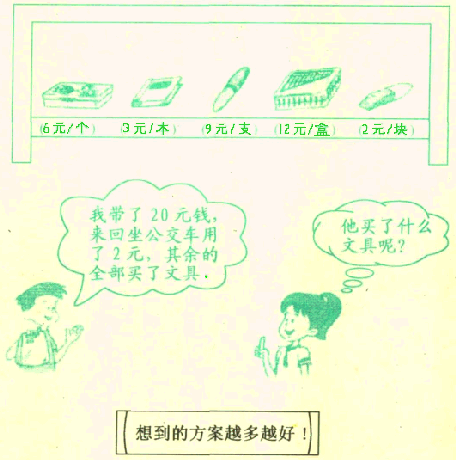 答案不唯一。如方案一:买一个铅笔盒,一支钢笔,一本作业本;方案二:买一盒彩笔,一个铅笔盒;方案三:买1个铅笔盒,三本作业本。 |