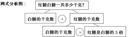 商店运来白糖200千克,运来红糖是白糖的3倍,商店运来的红糖白糖一共多少千克?(先把网式分析图补充完整,再列式解答)
