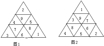 如上图所示,每4个小三角形组成的中三角形内,在求和时重复相加的小三角形内的数字是a、b、c,由已知可得:1+2+3+4+5+6+7+8+9+a+b+c=20×3,化简得,a+b+c=15,假设a、b、c是4、5、6,然后凑出其它的数字,使4+5+9+2=20,5+6+8+1=20,3+7+4+6=20,如下图1所示;假设a、b、c是3、5、7,然后凑出其它的数字,使3+7+1+9=20,2+6+5+7=20,4+8+3+5=20,如下图2所示;这样的填空的方式有多种,只要满足题意就可以,因此得解.