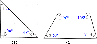 故答案为:(1)45°,45°,90°,180°;(2)120°,60°,180°,105°,75°180°,360°.