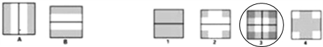 分析:把这两个图形重合后,如图这两个图形大小、形状相同,重叠后有两种可能,一种是把图A右移和图B重合,此时两个图中的线成“+”状态,中间是一个无色正方形,四个角会出现四个颜色较深的小正方形,也就是右边的图3;另一种是把其中一个图顺时针或逆时针旋转90°再重合,此时会变成图A或图B的样子,右图没有.